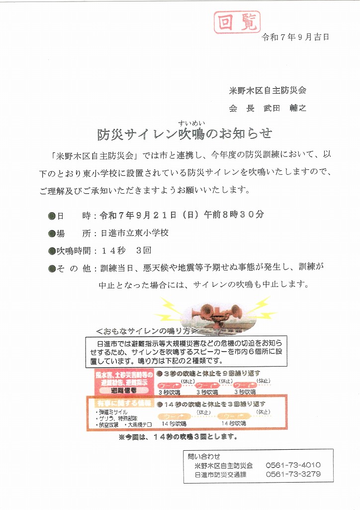 お知らせ 防災サイレン吹鳴のお知らせ 2025.09.18 Tweet Category:回覧板 Author:BO /blog/blog_comments/captcha/42659648 /blog/blog_comments/get_token ≪ 日東バザー2025 資源回収のお願いと結果報告 ≫