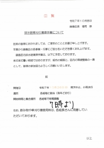 お知らせ もちつき大会 2025.11.14 イベント 12月21日 9時開催 藤島公会堂 前広場 続きを読む ほっとCafe藤島 2025.11.14 ほっとカフェ 続きを読む 藤島墓地清掃・点検活動のお知らせ 2025.11.14 回覧板 続きを読む 第8回ドクターズカフェ 2025.10.15 その他 続きを読む にっしん日本舞踊・舞踊殺陣・着付け子ども教室 生徒募集 2025.10.15 回覧板 続きを読む 令和7年度日進市一斉防災訓練 2025.10.15 防災訓練 続きを読む 米野木交番だより 令和7年11月号 2025.10.15 交番だより 続きを読む 龍谷寺道了カルチャーマーケット 2025.10.14 イベント 続きを読む 10月5日 白山宮例大祭 2025.10.14 その他 続きを読む 豊田厚生病院祭 2025.10.14 その他 続きを読む 排水路草刈り清掃作業について 2025.10.14 回覧板 続きを読む 資源回収のお願いと結果報告 2025.10.13 資源回収 続きを読む 防災サイレン吹鳴のお知らせ 2025.09.18 回覧板 続きを読む 日東バザー2025 2025.09.18 回覧板 続きを読む 令和7年度 白山宮 例大祭 2025.09.18 回覧板 続きを読む < 前へ 12345678 次へ >