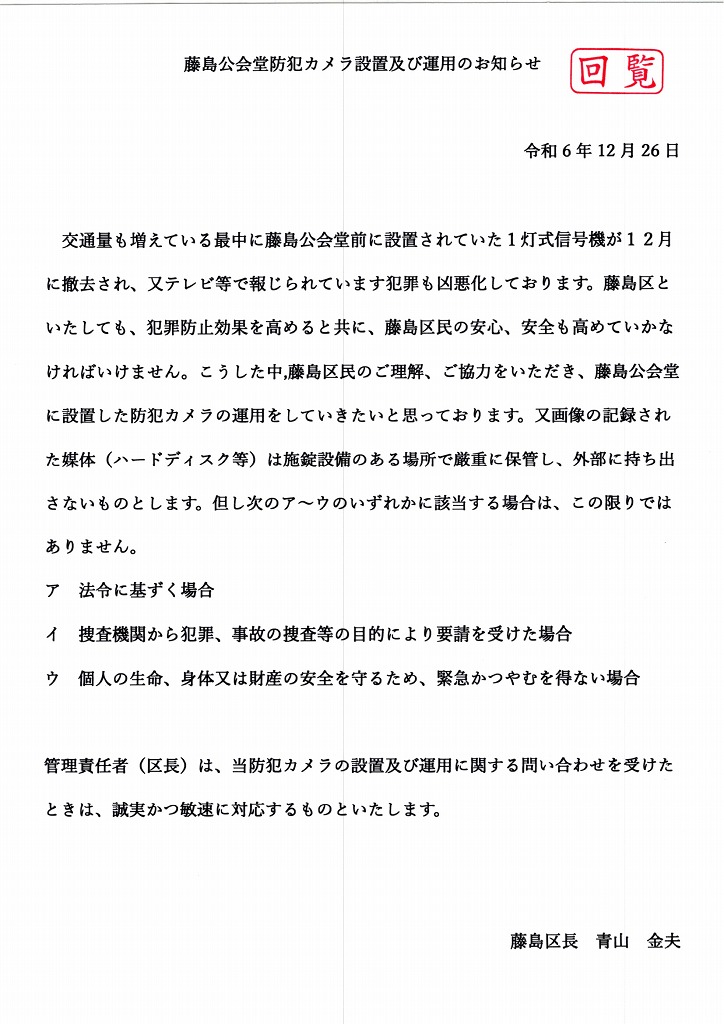 藤島公会堂防犯カメラ設置及び運用のお知らせ 2025.01.06 Tweet Category:回覧板 Author:BO /blog/blog_comments/captcha/66735207 /blog/blog_comments/get_token