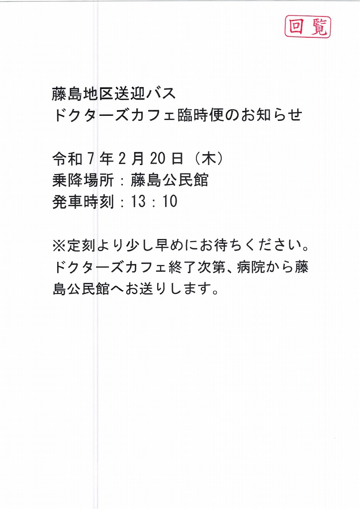 藤島地区 送迎バス ドクターズカフェ臨時便のお知らせ 2025.02.10 Tweet Category:回覧板 Author:BO /blog/blog_comments/captcha/70288084 /blog/blog_comments/get_token
