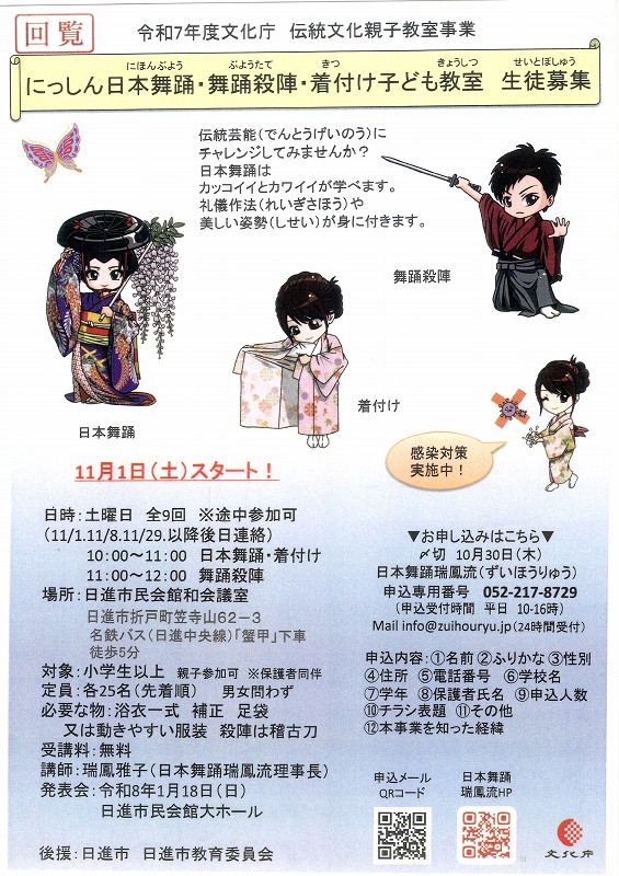 にっしん日本舞踊・舞踊殺陣・着付け子ども教室 生徒募集 2025.10.15 Tweet Category:回覧板 Author:BO /blog/blog_comments/captcha/34506016 /blog/blog_comments/get_token