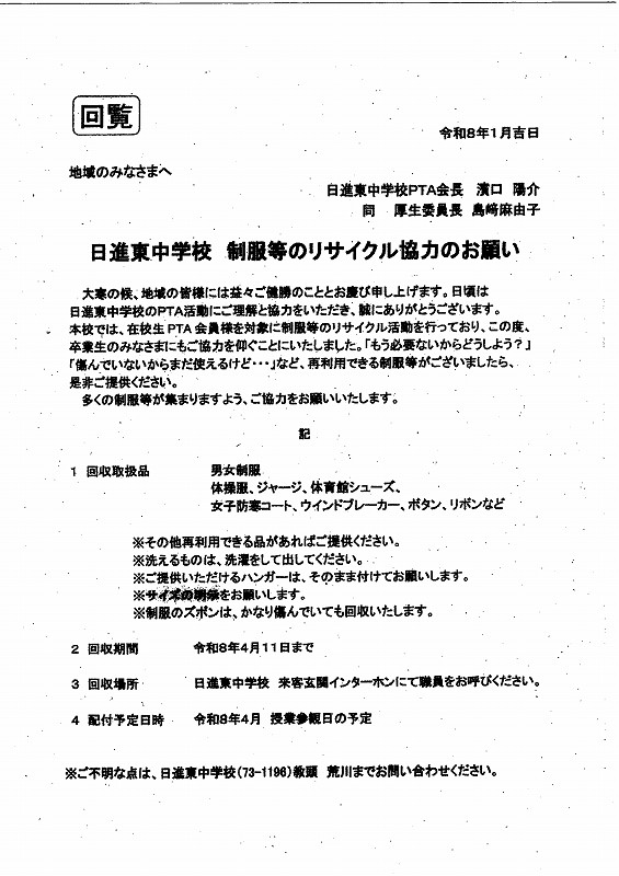 日進東中学校 制服等のリサイクル協力のお願い 2026.01.29 Tweet Category:回覧板 Author:BO /blog/blog_comments/captcha/92891161 /blog/blog_comments/get_token