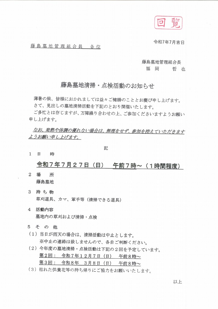 藤島墓地清掃・点検活動のお知らせ 2025.07.08 Tweet Category:お知らせ Author:BO /blog/blog_comments/captcha/71622221 /blog/blog_comments/get_token