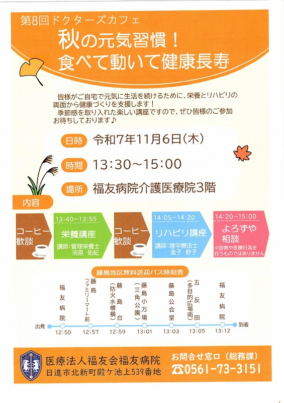 お知らせ 第8回ドクターズカフェ 2025.10.15 Tweet Category:その他 Author:BO /blog/blog_comments/captcha/11522651 /blog/blog_comments/get_token ≪ にっしん日本舞踊・舞踊殺陣・着付け子ども教室 生徒募集 藤島墓地清掃・点検活動のお知らせ ≫