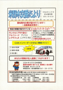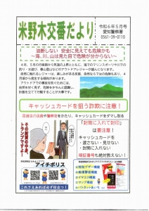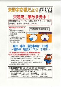 お知らせ 交番だより 米野木交番だより 令和7年11月号 2025.10.15 交番だより 続きを読む 米野木交番だより 令和7年9月号 2025.09.18 交番だより 続きを読む 自転車盗に注意!! 2025.07.08 交番だより 続きを読む 米野木交番だより 2024.12.12 交番だより 続きを読む 令和6年11月号 米野木交番だより 2024.10.17 交番だより 続きを読む 米野木交番だより 2024.04.23 交番だより 令和6年5月号 続きを読む 米野木交番だより 2023.12.27 交番だより 令和6年1月号 続きを読む 米野木交番だより 2023.10.24 交番だより 続きを読む 米野木交番だより 2023.06.20 交番だより 米野木交番だより令和5年7月号 愛知警察署 警察官・警察職員募集 あなたのタイヤが狙われています! 続きを読む